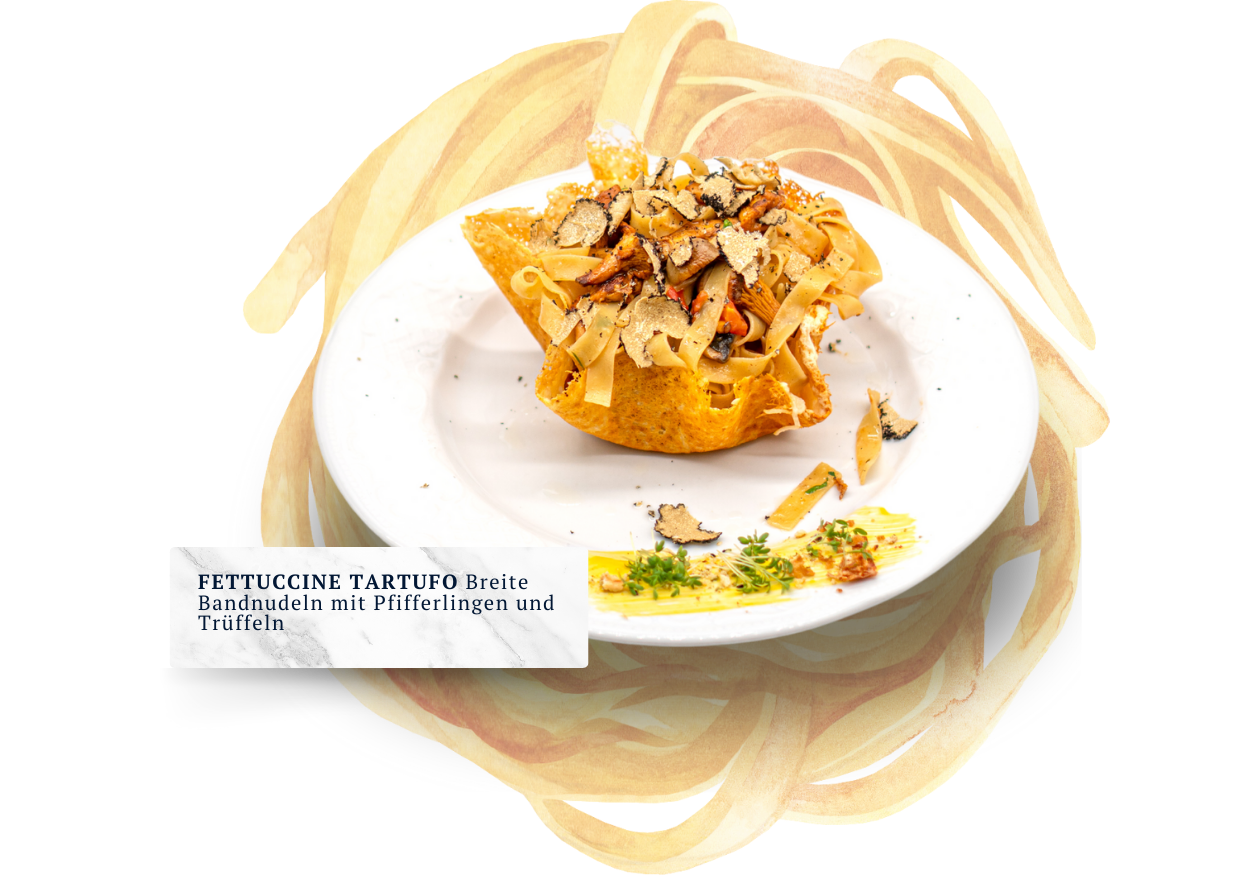 Erleben Sie den feinen Geschmack der Fettuccine Tartufo! Feinste Bandnudeln, kombiniert mit aromatischen Saisonpilzen, verfeinert durch zart schmelzende Trüffelbutter und edles Trüffelöl. Serviert in einem kunstvollen Parmesan-Nest, verleiht frisch geraspelter Trüffel diesem Gericht den krönenden Abschluss. Ein Meisterwerk der Aromen – für echte Feinschmecker!